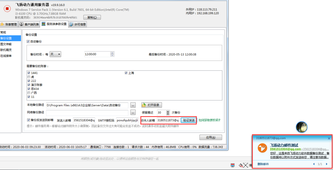 5.在收件人郵箱中填入收件郵箱,點擊驗證發送,若能收到郵件則表明設置成功。以后每天自動備份時,都能收到備份的郵件信息