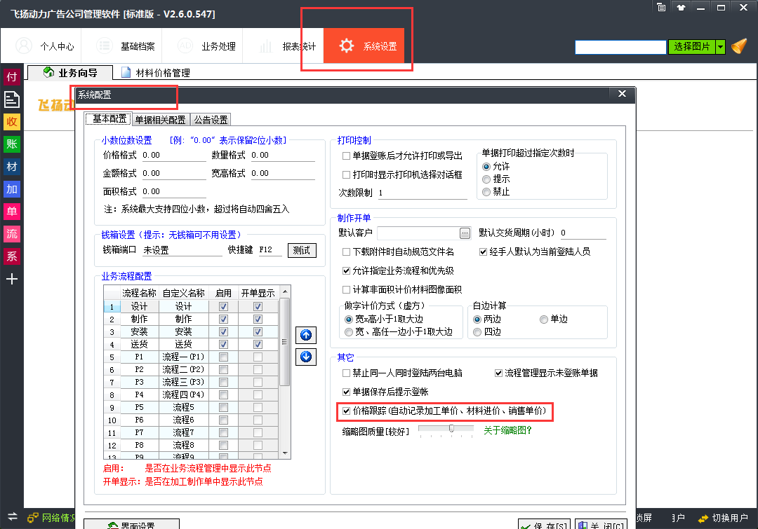 現在的很多廣告公司,在客戶來做加工的時候,一樣的材料,一般都會沿用上次的制作價格 在開手工單據的時候,還需要去查詢上次開單的價格,這樣對于廣告公司來說,就會顯得很麻煩 飛揚動力廣告公司管理軟件針對廣告公司這個要求,制定了“價格跟蹤”這個功能 價格跟蹤是指:開業務單時,沿用上次給該客戶開單時此材料的單價。 價格跟蹤具體來講:某客戶在軟件中用某材料開過單之后。 在....