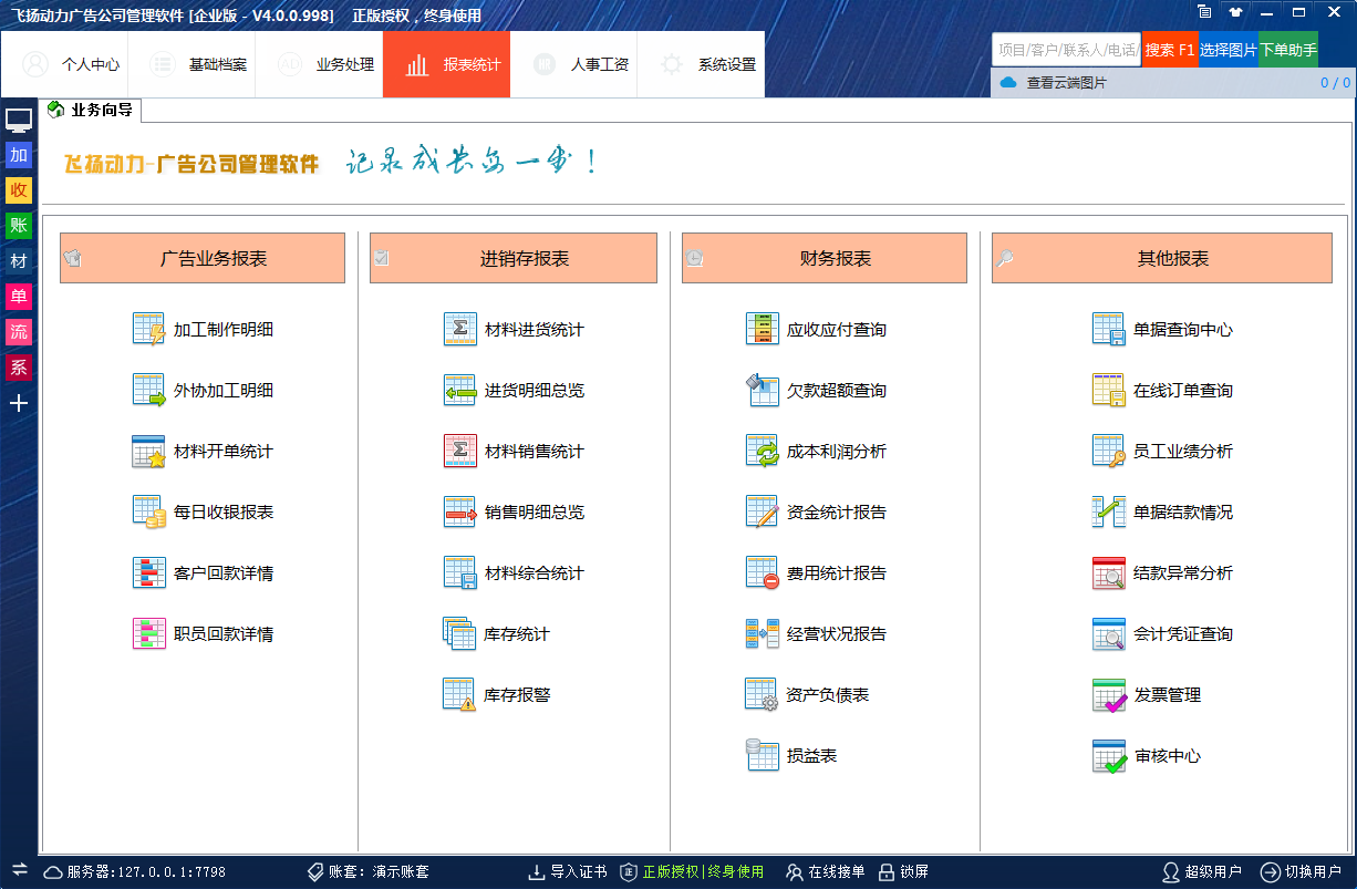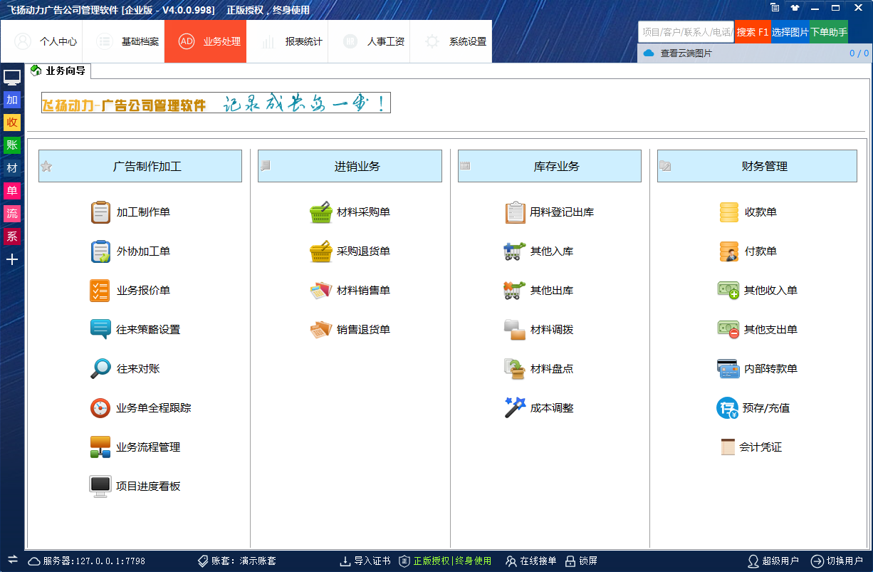 飛揚動力廣告公司管理軟件企業版集業務開單、外協加工管理、人事工資管理、業務流程管理、客戶管理、材料管理、往來策略(不同的客戶不同的價格)、業務單打印等多種管理功能為一體,適合中大型、連鎖型、集團型廣告制作企業。軟件通過將現代化企業管理理念同先進技術架構相結合,打造一體化數字管理體系,幫助廣告企業提升工作效率,實現數字化運營,讓企業管理更加高效、便捷。軟件能規范業務訂單,減少錯單重噴降低材料消耗,提高生產效率,及時統計分析、財務盈虧狀況,是廣告制作公司提升核心競爭力的必備“武器”!