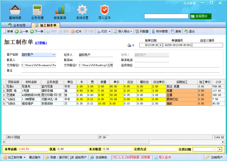 與日常使用的訂單完全吻合,適用于廣告制作各細分行業,制單簡潔快速,直接拖拽圖片即可完成一筆業務錄入,并且自動分析圖片尺寸、用料、價格跟蹤及自動計算小計等,所有操作僅需一步拖拽動作。